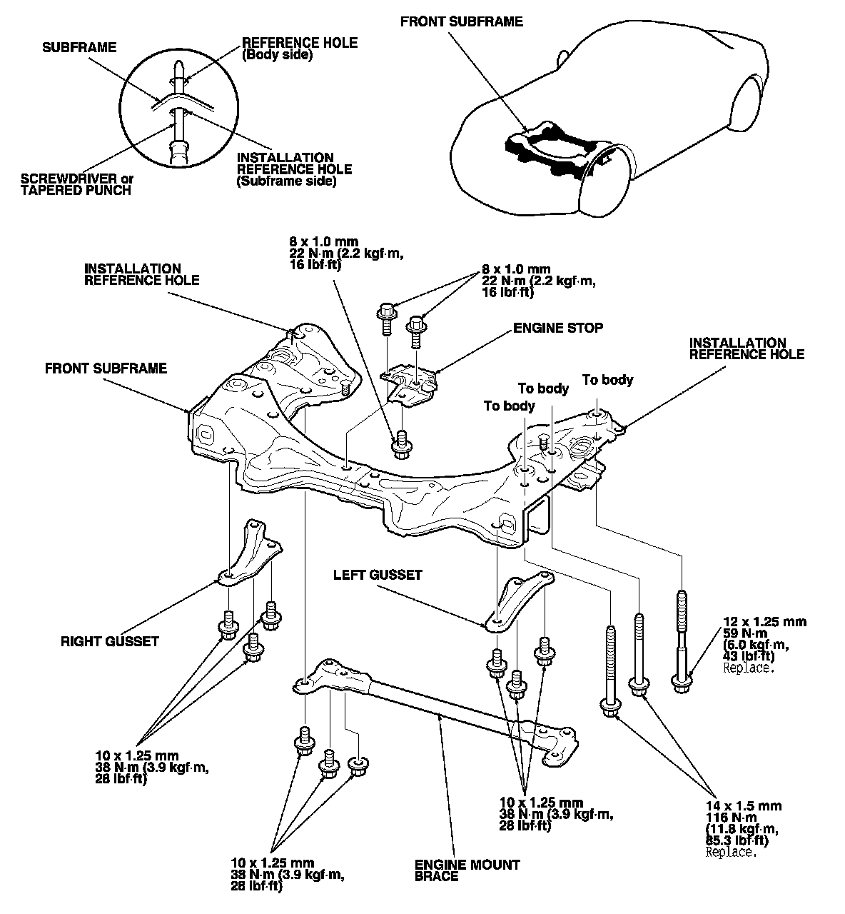 After loosening the subframe mounting bolts, be sure to replace them with new ones.
