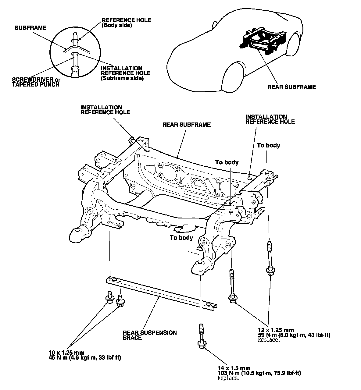 After loosening the subframe mounting bolts, be sure to replace them with new ones.