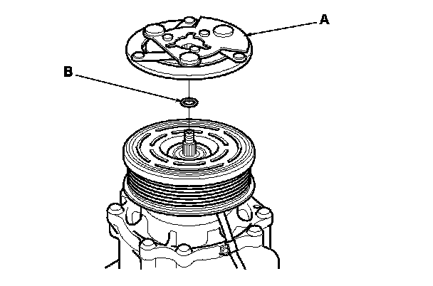 1. Remove the center nut (A) while holding the armature plate with a commercially available A/C clutch holder (B).