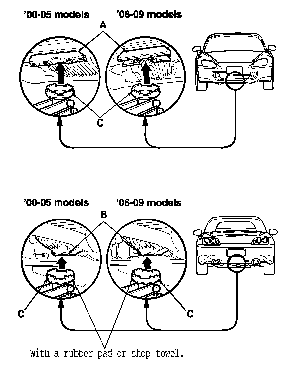 3. Position the floor jack under the front jacking bracket (A) or the rear differential carrier (B). Center the jacking bracket on the jack lift platform (C), and jack up the vehicle high enough to fit the safety stands under it.