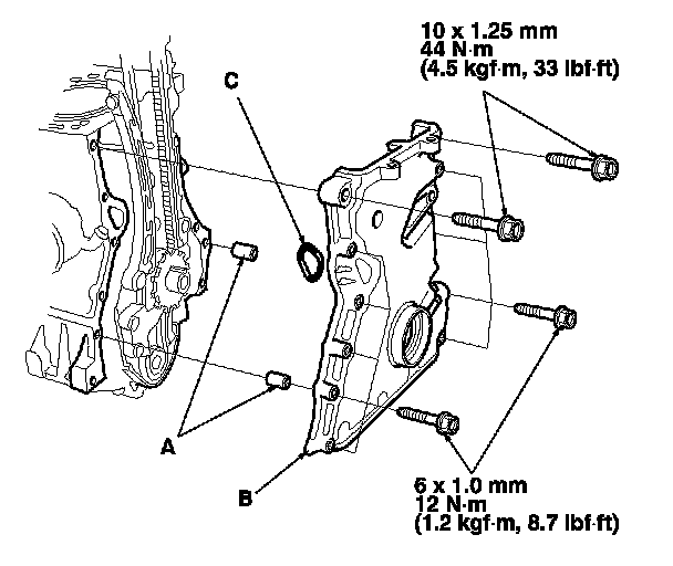 Apply a light coat of new engine oil to the lip of the chain case oil seal, then install the dowel pins (A) and the chain case (B) using a new O-ring (C).