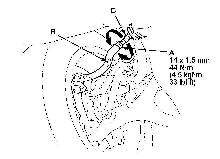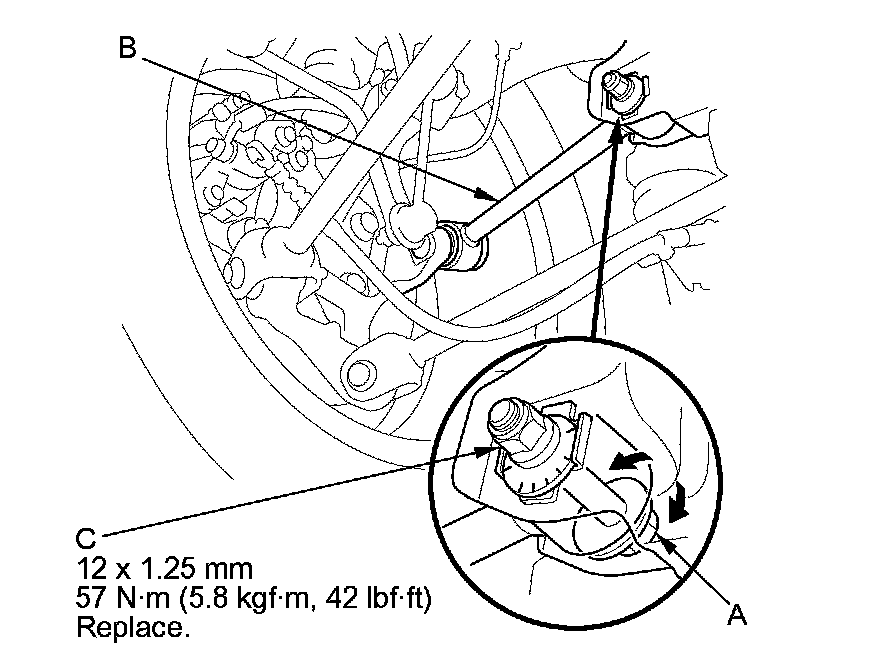 3. Hold the adjusting bolt (A) on the rear control arm (B), and loosen the self-locking nut (C).