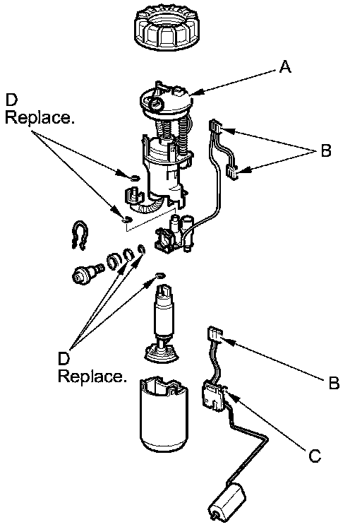 - When installing the fuel gauge sending unit (C), make sure the connection is secure and the connectors is firmly locked into place. Be careful not to bend or twist it excessively.