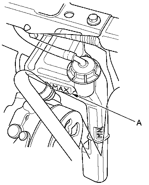 6. Fill the coolant reservoir to the MAX mark (A) with Honda Long Life Antifreeze/Coolant Type 2.