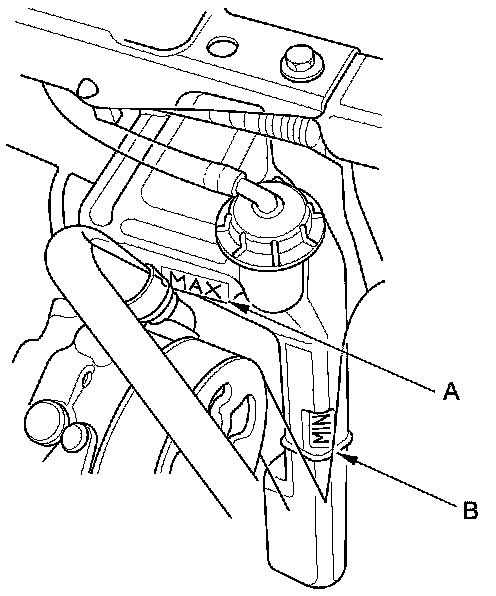 1. Check the coolant level in the coolant reservoir. Make sure it is between the MAX mark (A) and the MIN mark (B).