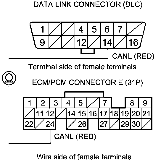 31. Check for continuity between ECM/PCM connector terminal E24 and DLC terminal No. 14.