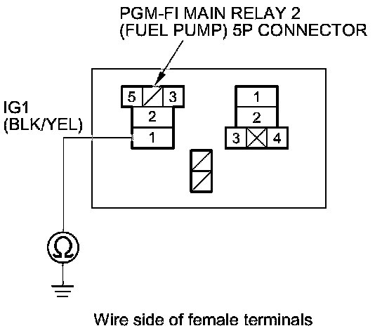 46. Check for continuity between PGM-FI main relay 2 (FUEL PUMP) 5P connector terminal No. 1 and body ground.