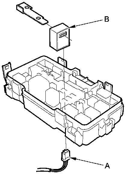 4. Remove the under-hood fuse/relay box lower cover (B) from the fuse/relay box.