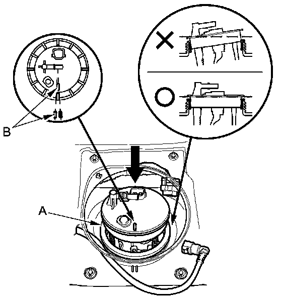 1. Temporarily attach a new base gasket (A) to the fuel tank unit (B), then insert the fuel tank unit into the fuel tank.