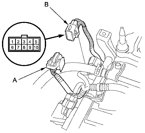 1. Disconnect transmission range switch subharness connector C104 (A), then remove the connector (B) from its bracket.