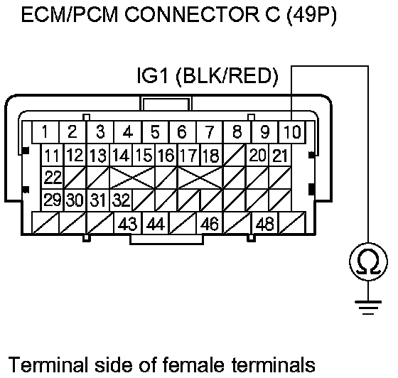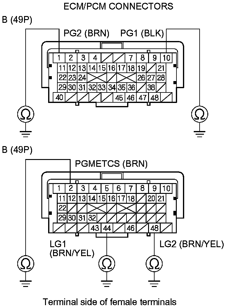 73. Check for continuity between body ground and ECM/PCM connector terminals B1, B10, C2, C44, and C48 individually.