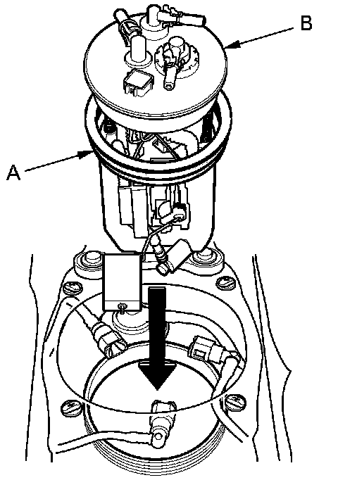 1. Temporarily attach a new base gasket (A) to the fuel tank unit (B), then insert the fuel tank unit partially into the fuel tank.
