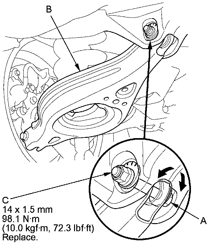 3. Hold the adjusting bolt (A) on lower arm B, and loosen the self-locking nut (C).