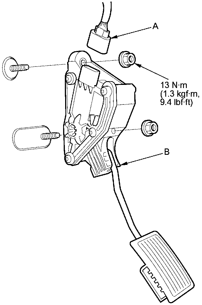 2. Remove the accelerator pedal module (B).