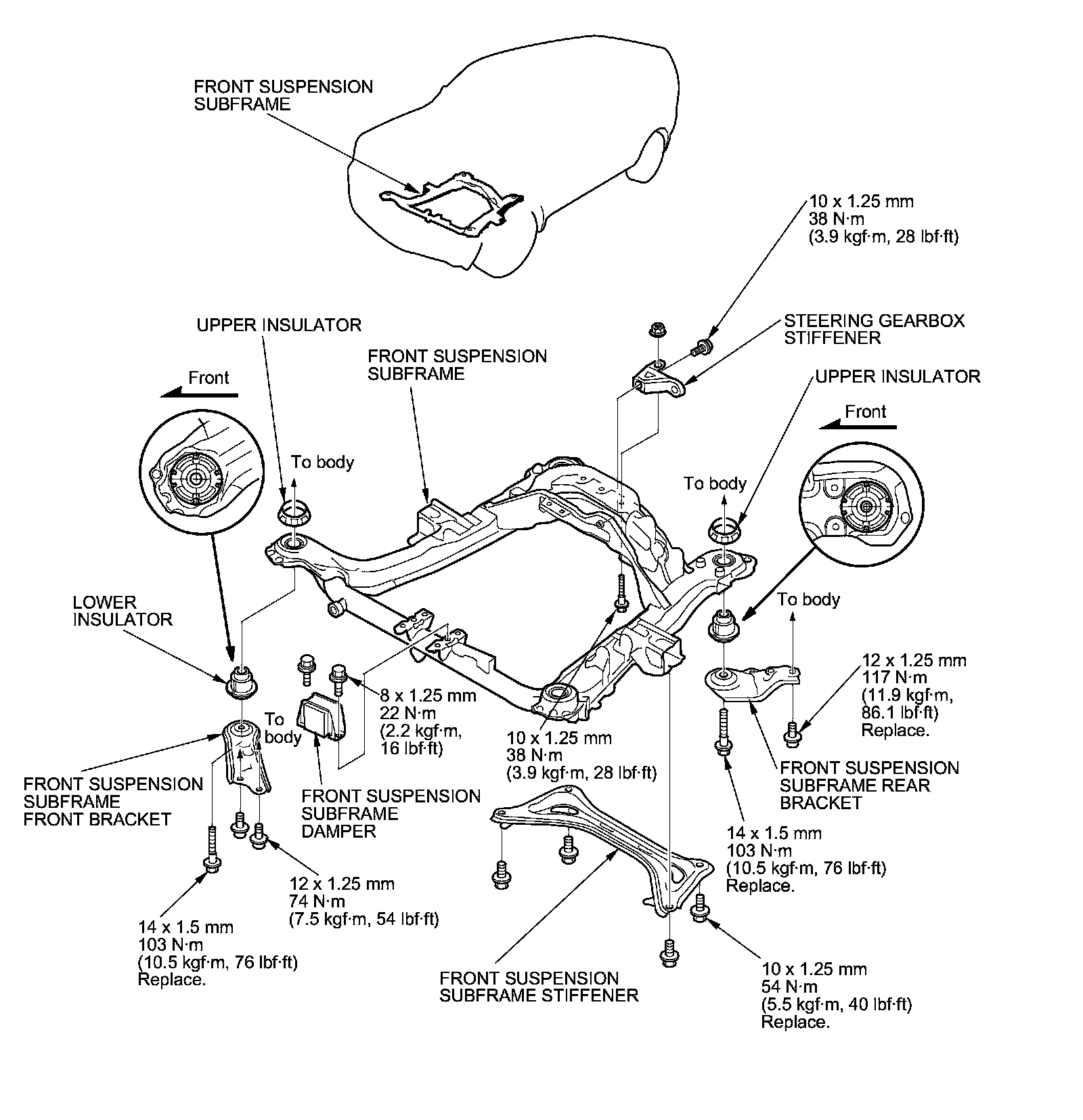 - After removing the subframe mounting bolts, be sure to replace them with new ones.