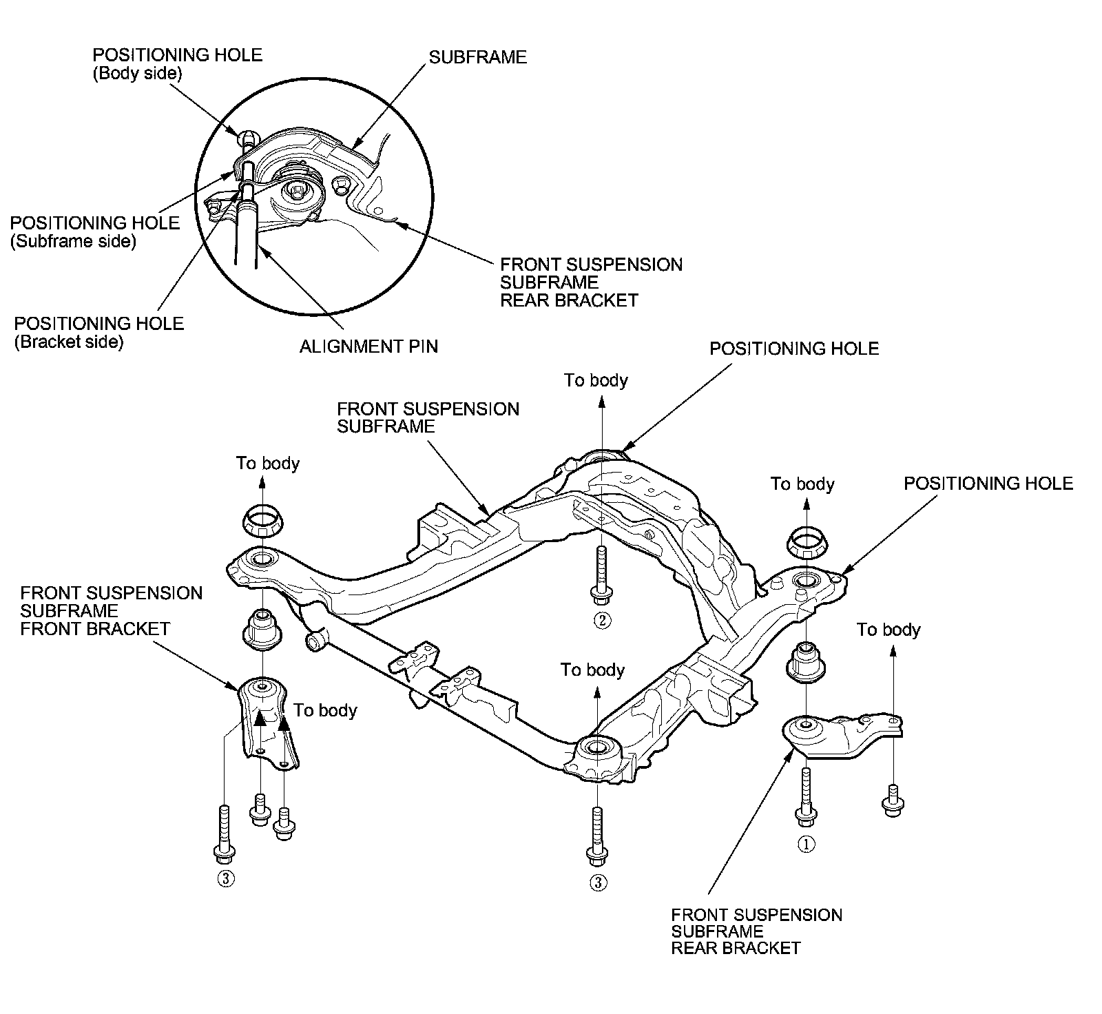 - After mounting the subframe and brackets loosely, align all of the positioning holes in the subframe, the subframe front bracket, and the body using a alignment pin as a guide, then tighten the bolts.
