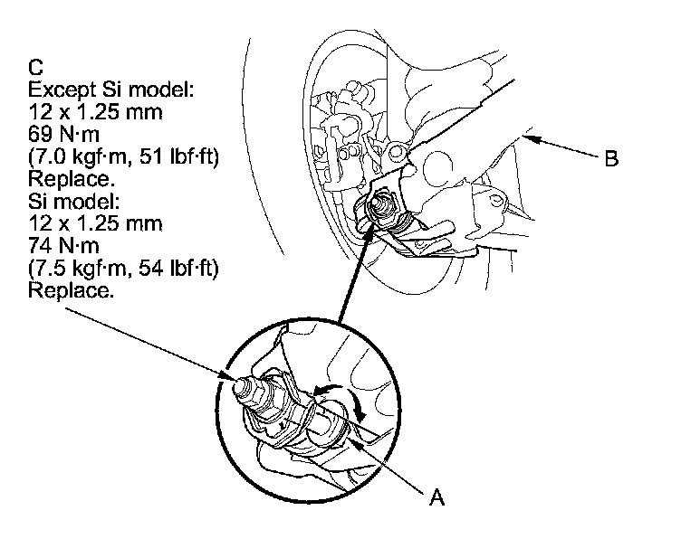 - Install the washers (B) included adjusting bolt set between the front damper and self-locking nut (C).