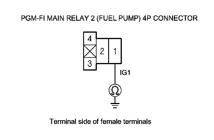 51. Check for continuity between PGM-FI main relay 2 (FUEL PUMP) 4P connector terminal No. 1 and body ground.