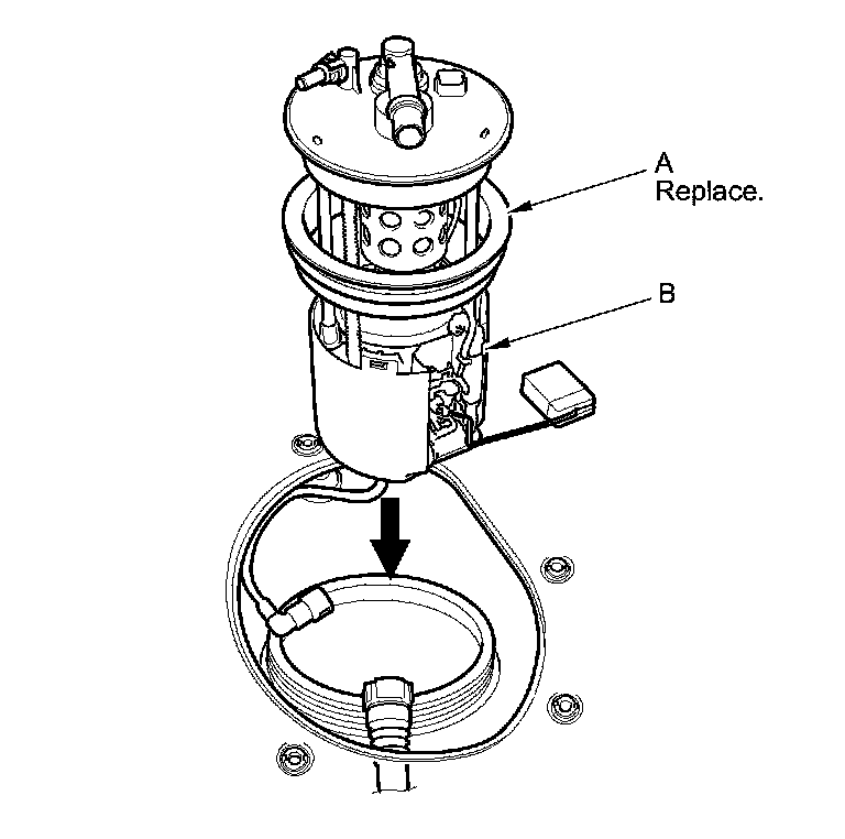 1. Temporarily attach a new base gasket (A) to the fuel tank unit (B), then insert the fuel tank unit partially into the fuel tank.