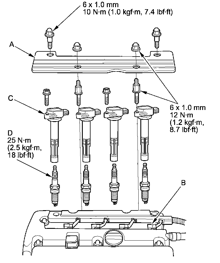 2. Disconnect the ignition coil connectors (B), then remove the ignition coils (C).