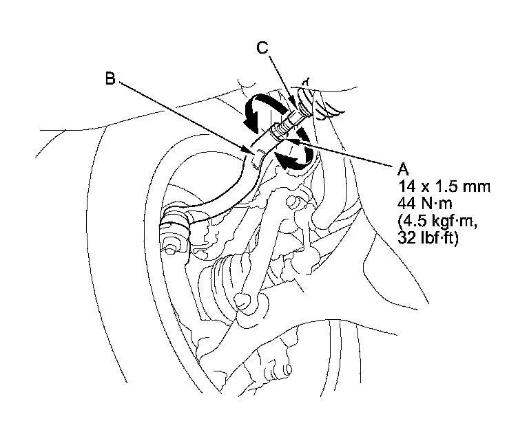3. Hold the adjusting bolt (A) on the rear control arm (B), and loosen the self-locking nut (C).