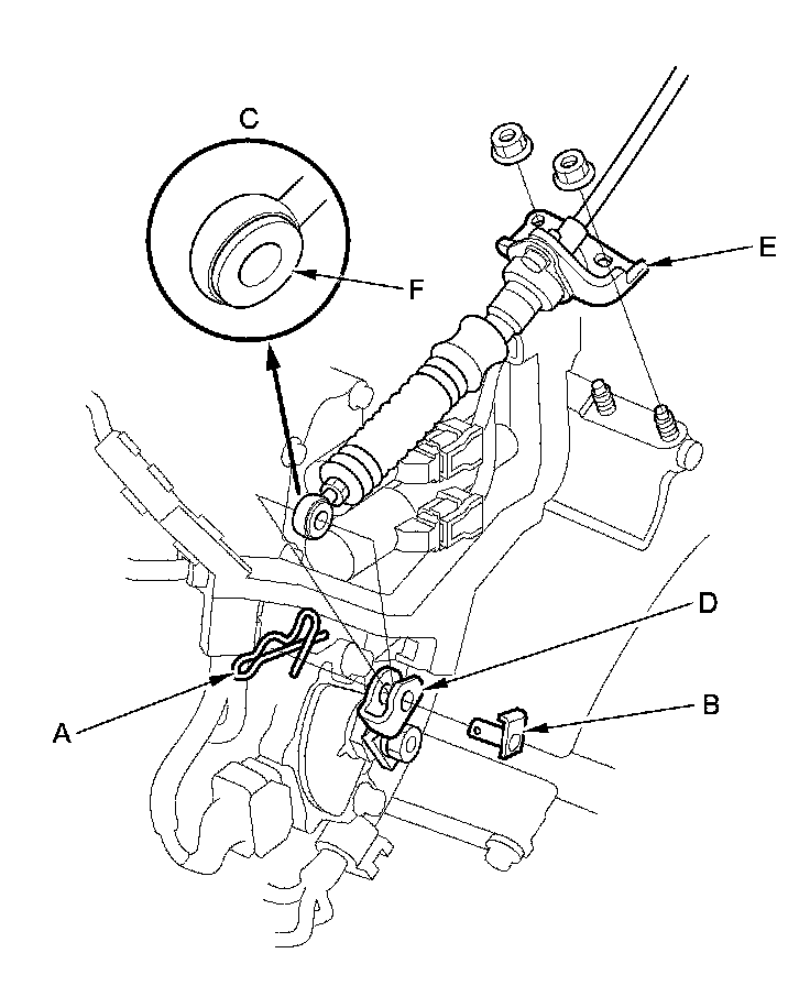 6. Check the bushing (F) in the shift cable end for proper fit and wear. If the bushing is loose or worn, replace the shift cable Service and Repair.