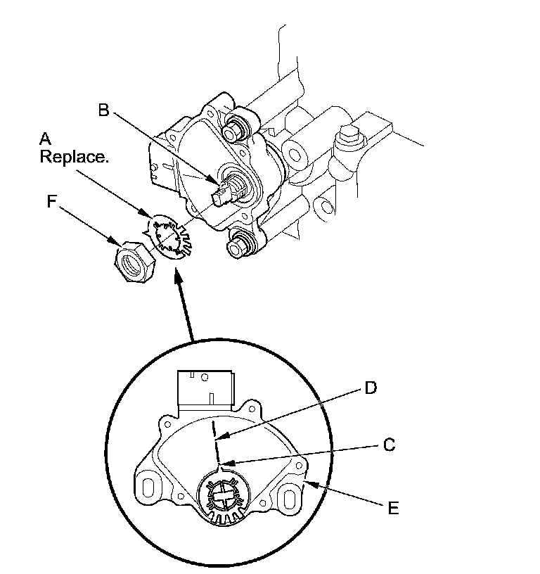 14. Install a new lock washer (A) over the selector control shaft (B) by aligning the indicator tab (C) of the lock washer with the N positioning line (D) on the transmission range switch (E), and install the locknut (F).