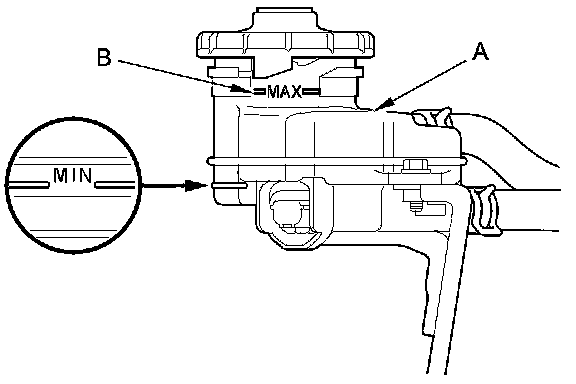 1. Make sure the brake fluid level in the reservoir (A) is at the MAX (upper) level line (B).