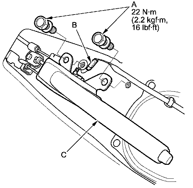 3. Remove the bolts (A) and the wire harness (B), then remove the parking brake lever (C).