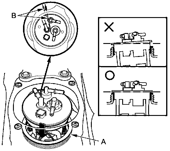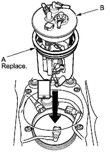 1. Temporarily attach a new base gasket (A) to the fuel tank unit (B), then insert the fuel tank unit partially into the fuel tank.