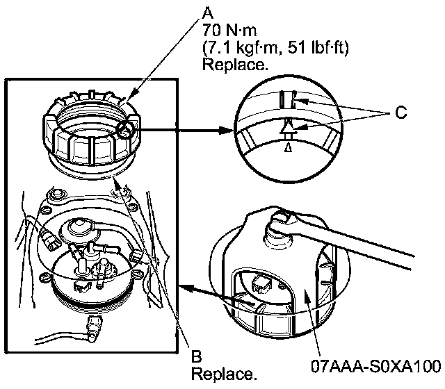 - Before tightening, align the marks (C) on the fuel tank and the locknut.