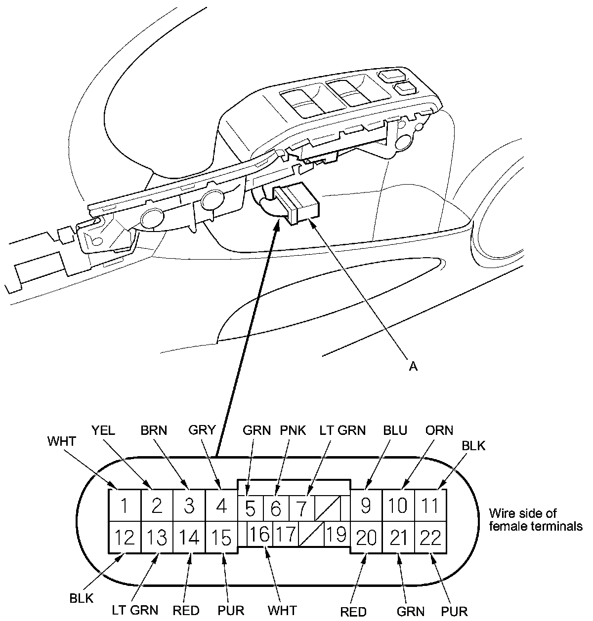 2. Disconnect the 22P connector (A) from the power window master switch.