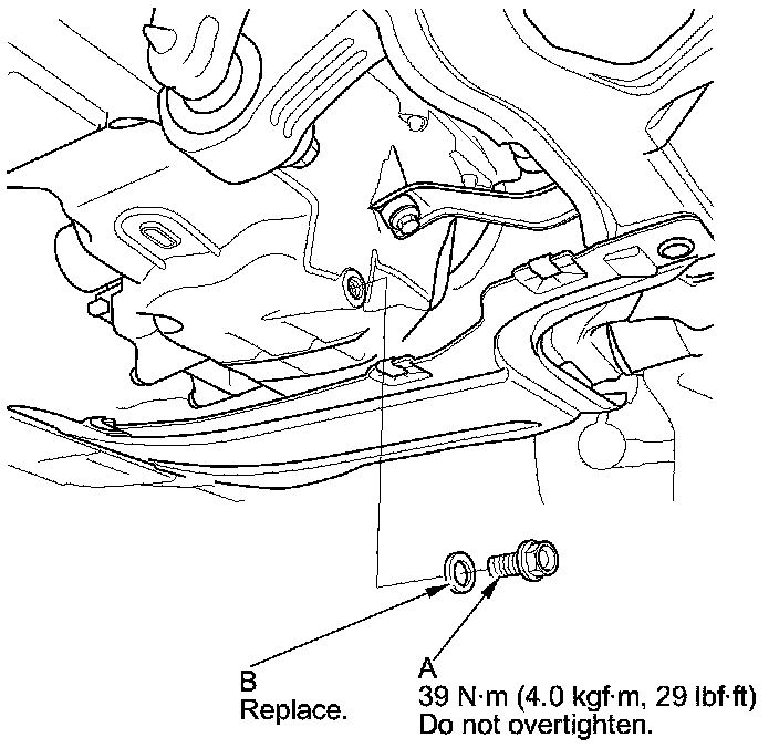 4. Reinstall the drain bolt with a new washer (B) and torque to specification.