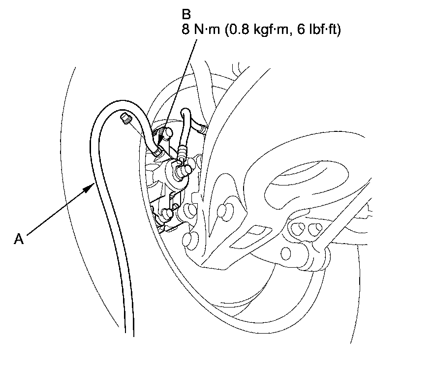 4. Attach a length of clear drain tube (A) to the bleed screw (B), then loosen the bleed screw to allow air to escape from the system. Then tighten the bleed screw securely.