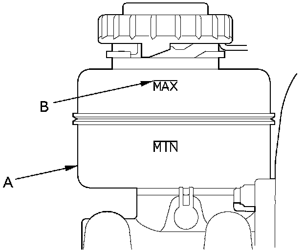 1. Make sure the brake fluid level in the reservoir (A) is at the MAX (upper) level line (B).
