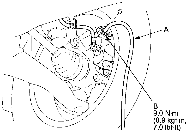 4. Attach a length of clear drain tube (A) to the bleed screw (B), then loosen the bleed screw to allow air to escape from the system. Then tighten the bleed screw securely.