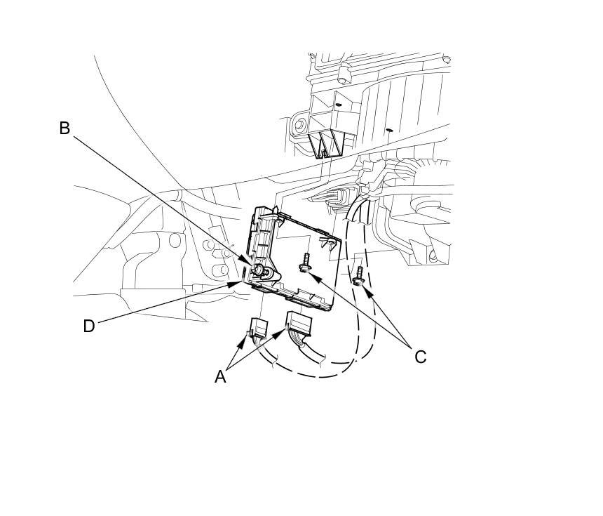 2. Disconnect the connectors (A). Loosen the bolt (B) and remove the bolts (C) from the climate control unit (D).