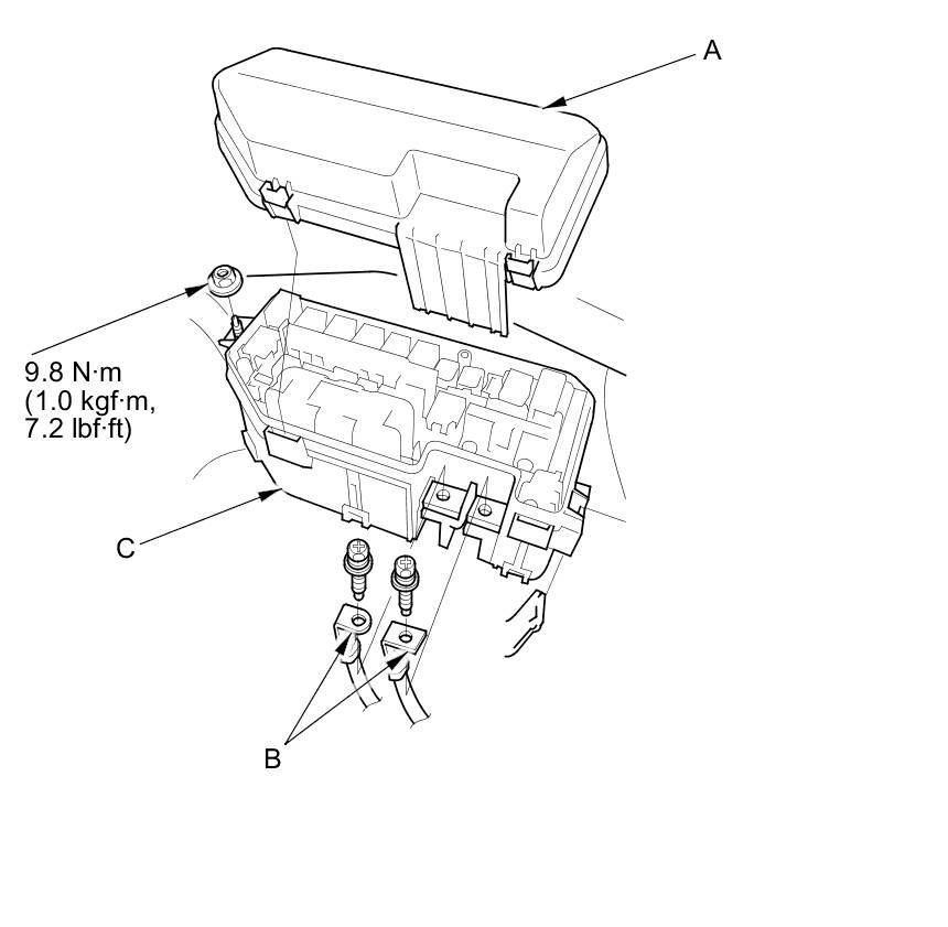 3. Remove the under-hood fuse/relay box (C) from the bracket.
