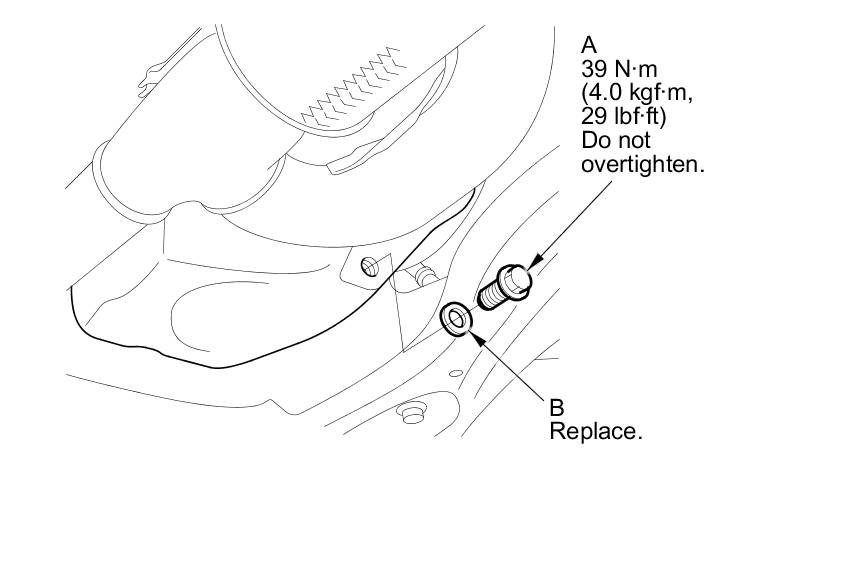 3. Reinstall the drain bolt with a new washer (B) and torque to specification.