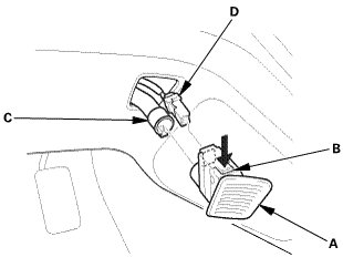 1. Carefully pry out the shift lever panel (A) with the appropriate trim tool to detach the clips (B, C) and the hooks (D), then remove the shift lever panel.
