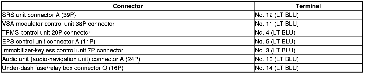-NO- Repair a short in the K LINE wire between the DLC terminal No. 7 and the SRS unit, the VSA modulator-control unit, the TPMS control unit, the EPS control unit, the immobilizer-keyless control unit, the audio unit, the audio-navigation unit, or the driver's under-dash fuse/relay box.