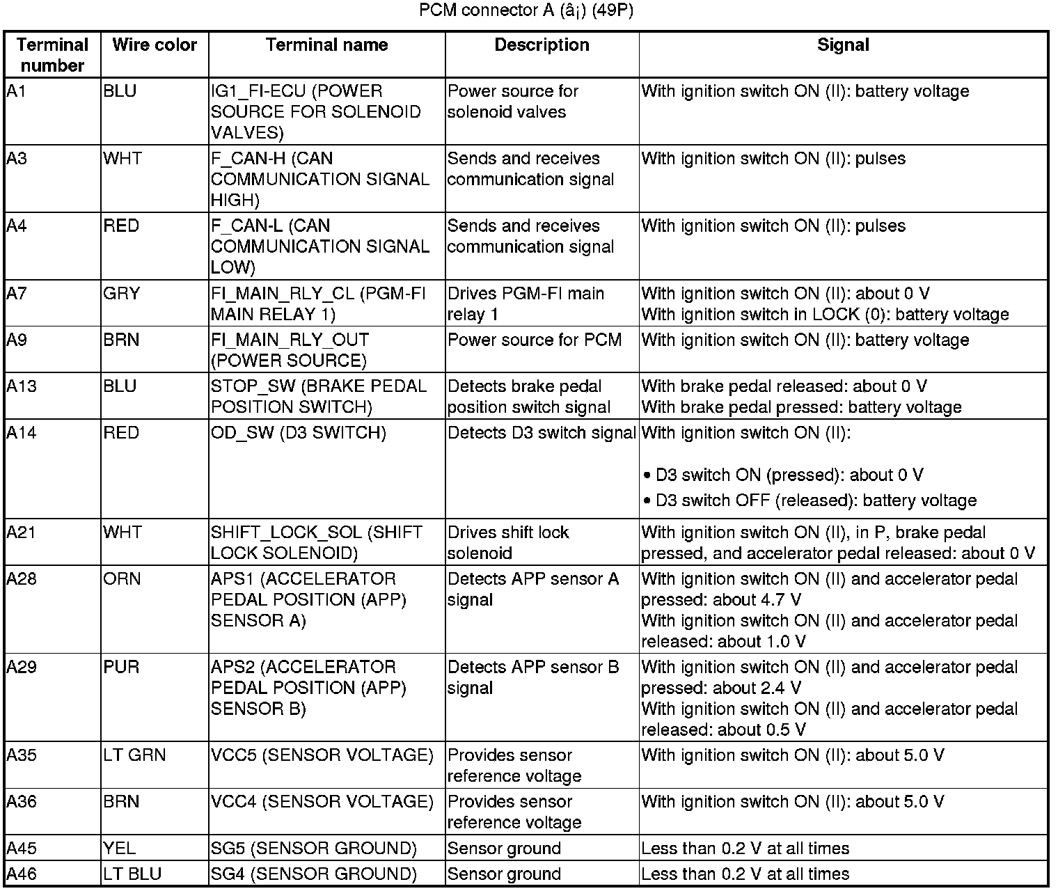 PCM A/T Control System Inputs and Outputs at PCM connector A (square) (49P)