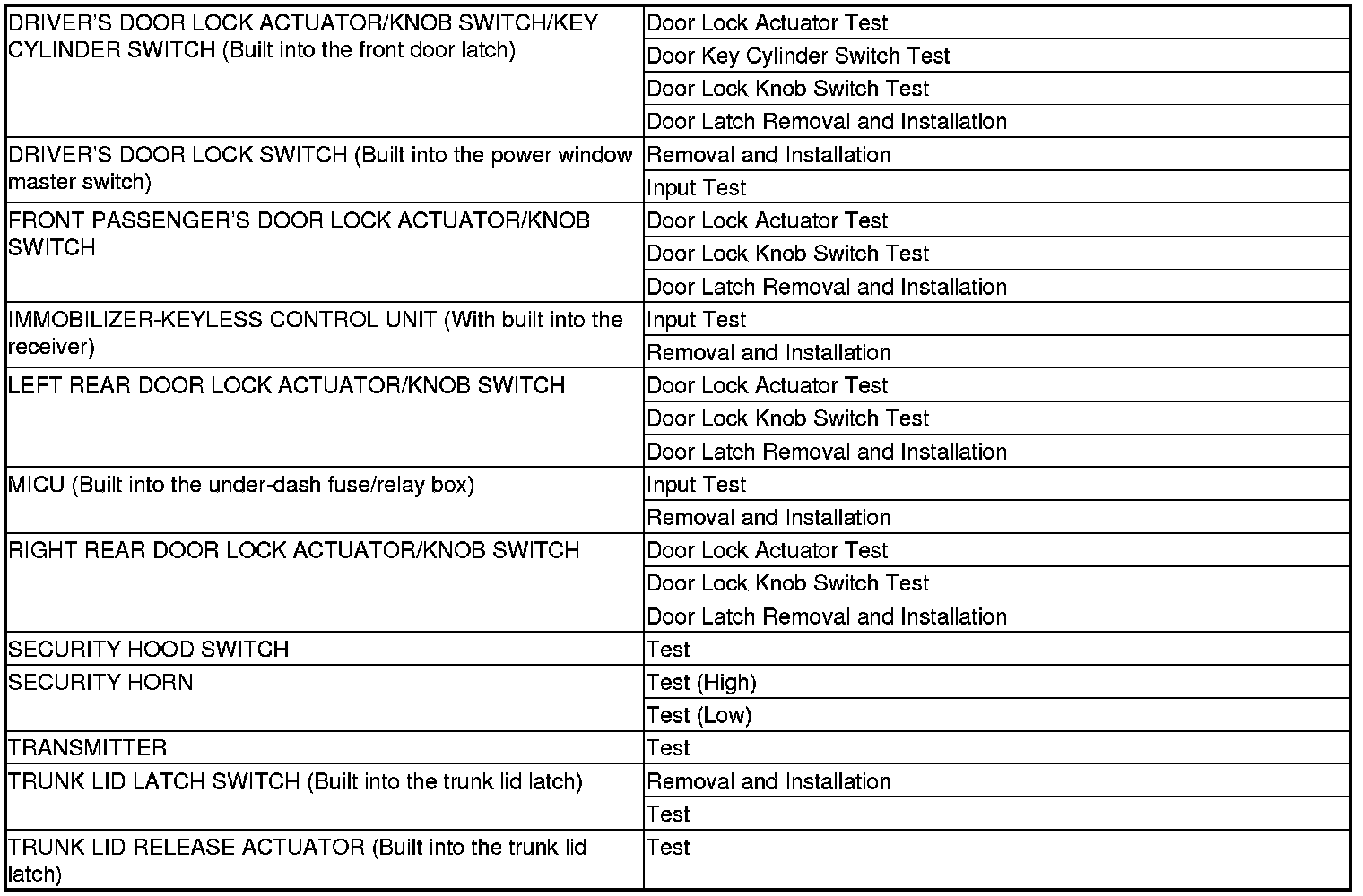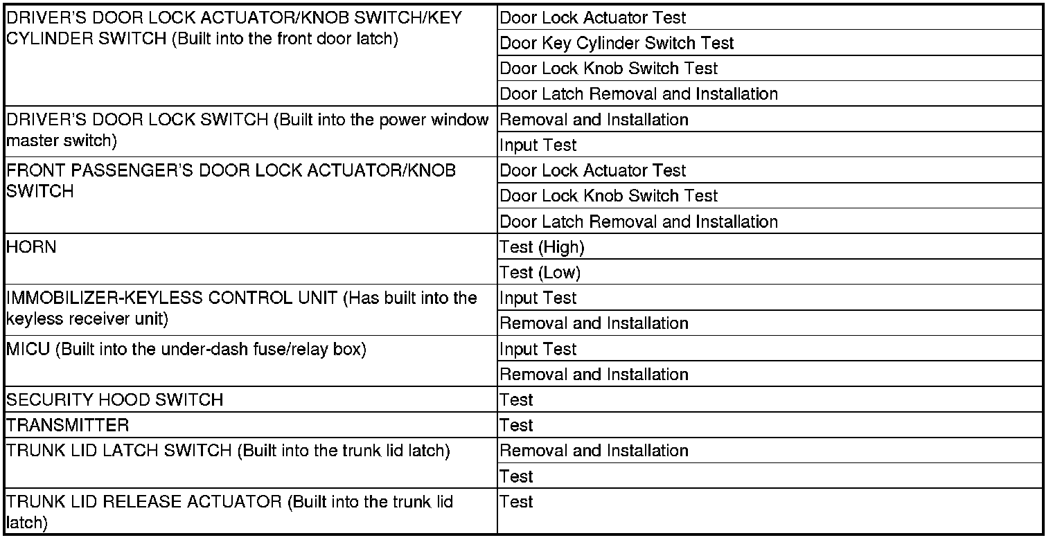 Keyless/Power Door Locks/Security System Component Location Index