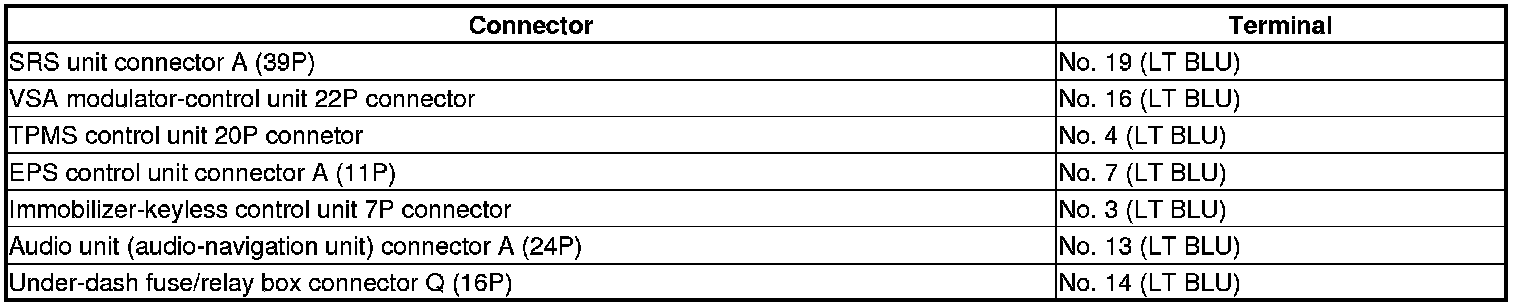 -NO- Repair a short in the K_LINE wire between the DLC terminal No. 7 and the SRS unit, the VSA modulator-control unit, the TPMS control unit, the EPS control unit, the immobilizer-keyless control unit, the audio unit, the audio-navigation unit, or the driver's under-dash fuse/relay box.