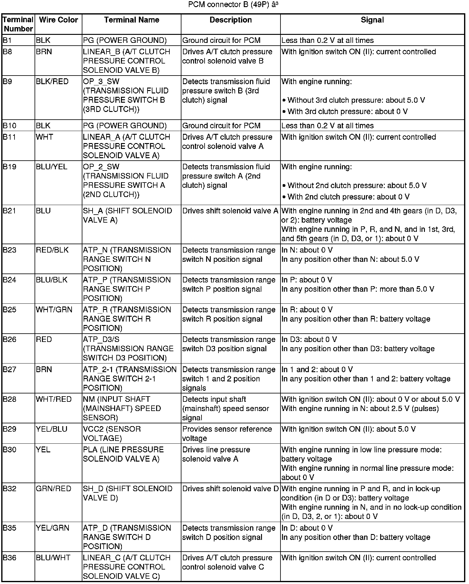 PCM A/T Control System Inputs and Outputs at PCM connector B (49P) (triangle)