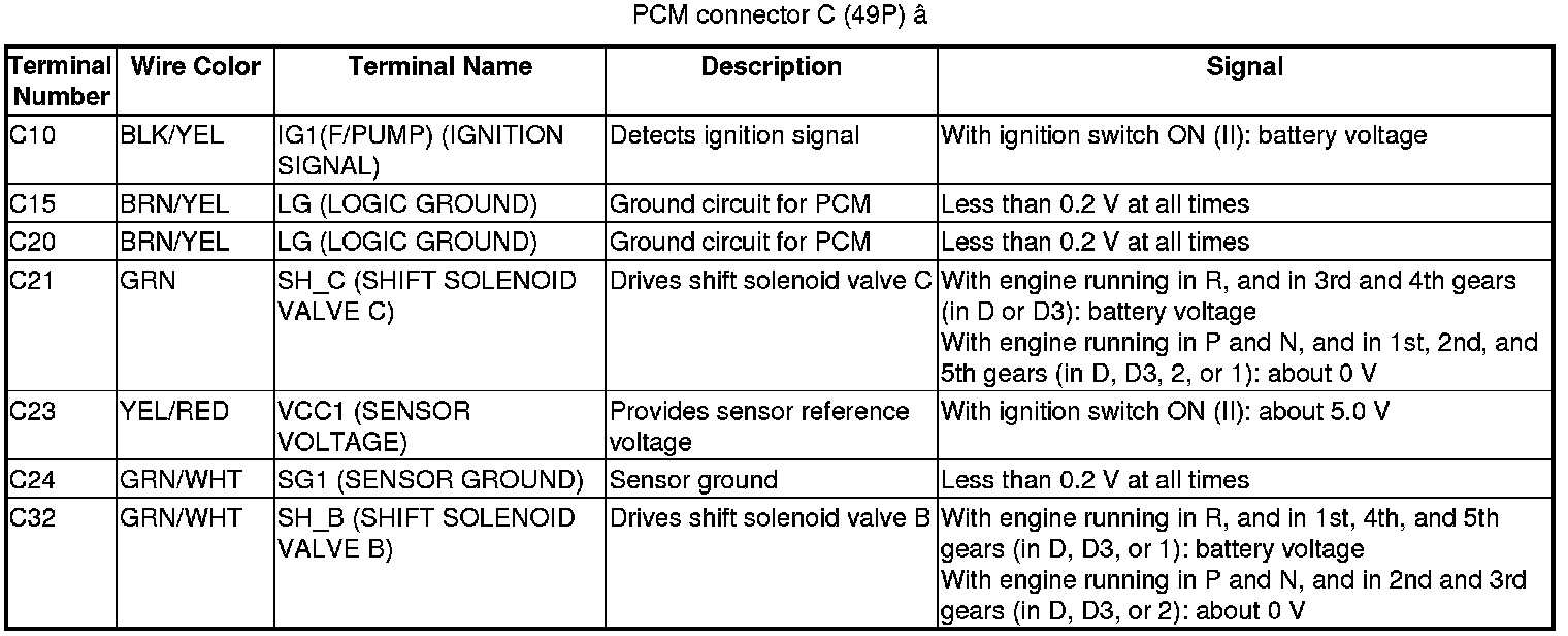 PCM A/T Control System Inputs and Outputs at PCM connector C (49P) (circle)