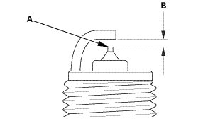 2. Replace the plug at the specified interval, if the center electrode (A) is rounded, if the spark plug gap (B) is out of specification, or if the spark plug electrode is dirty or contaminated. Use only the spark plugs listed.