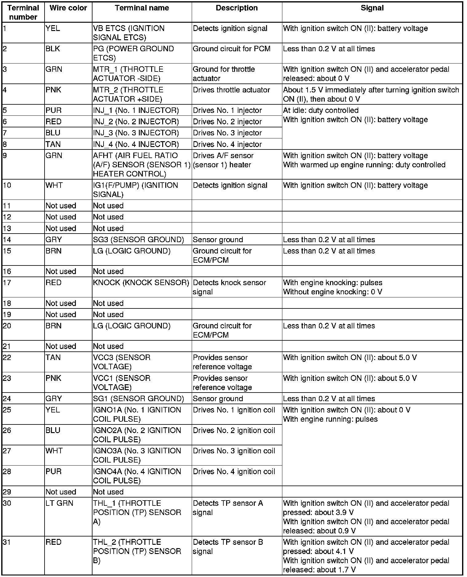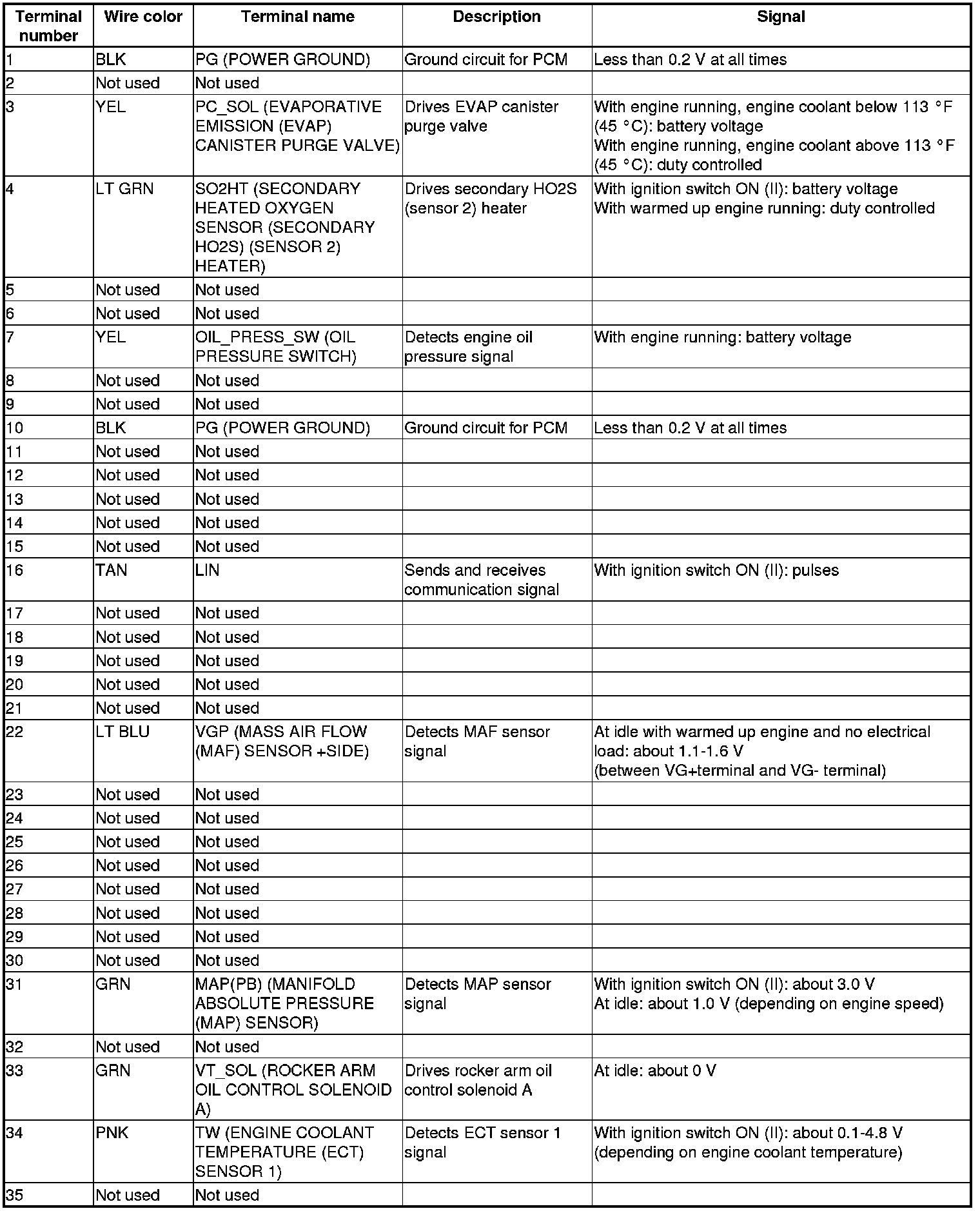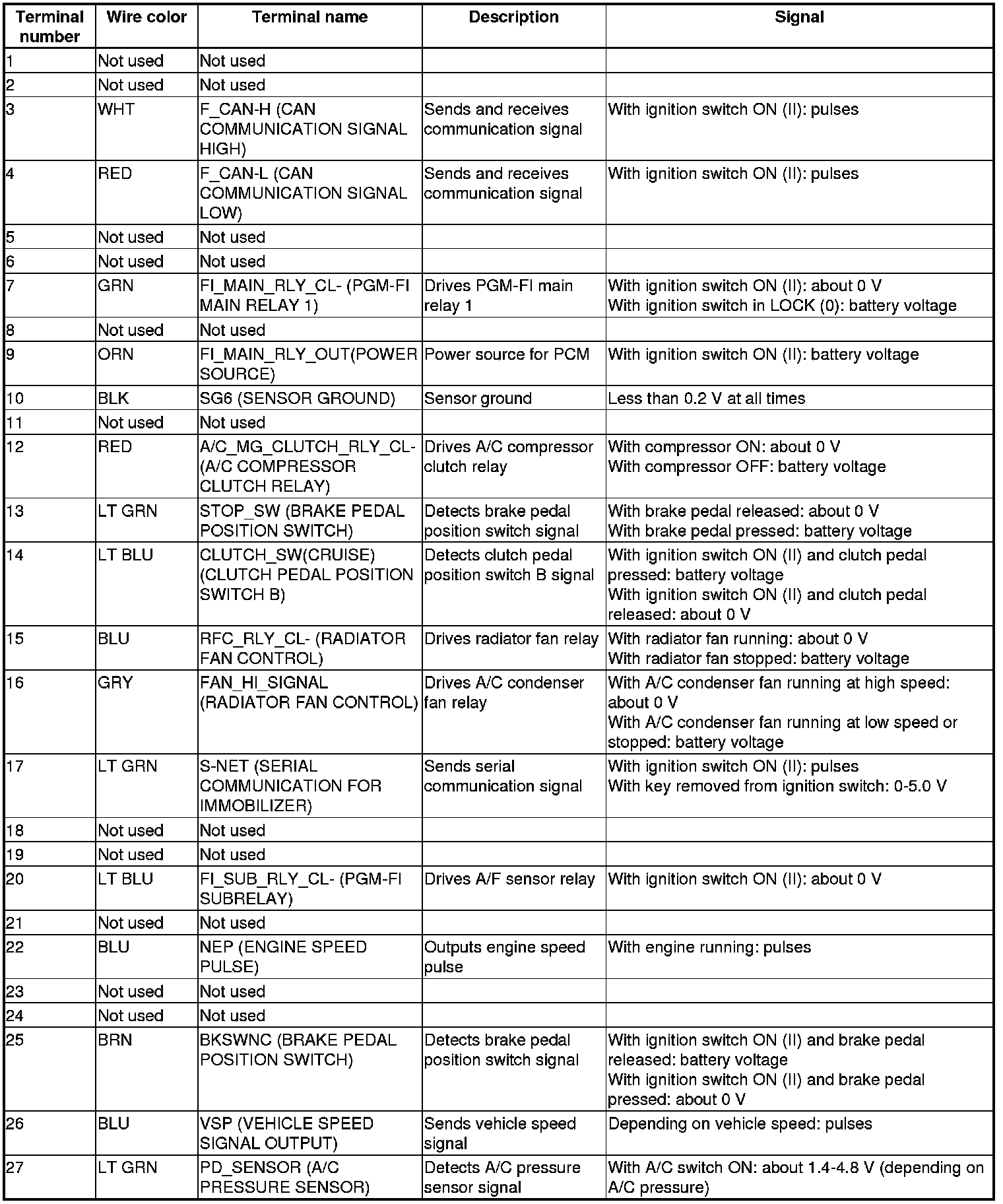 Pinout Values and Diagnostic Parameters