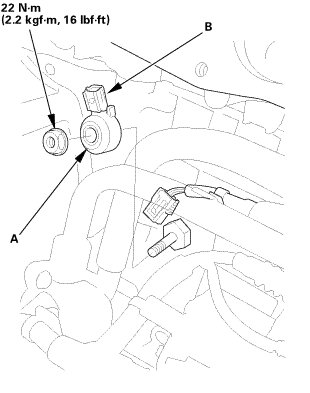 NOTE: When installing the knock sensor, make sure the direction of the sensor connector (B) is facing up.