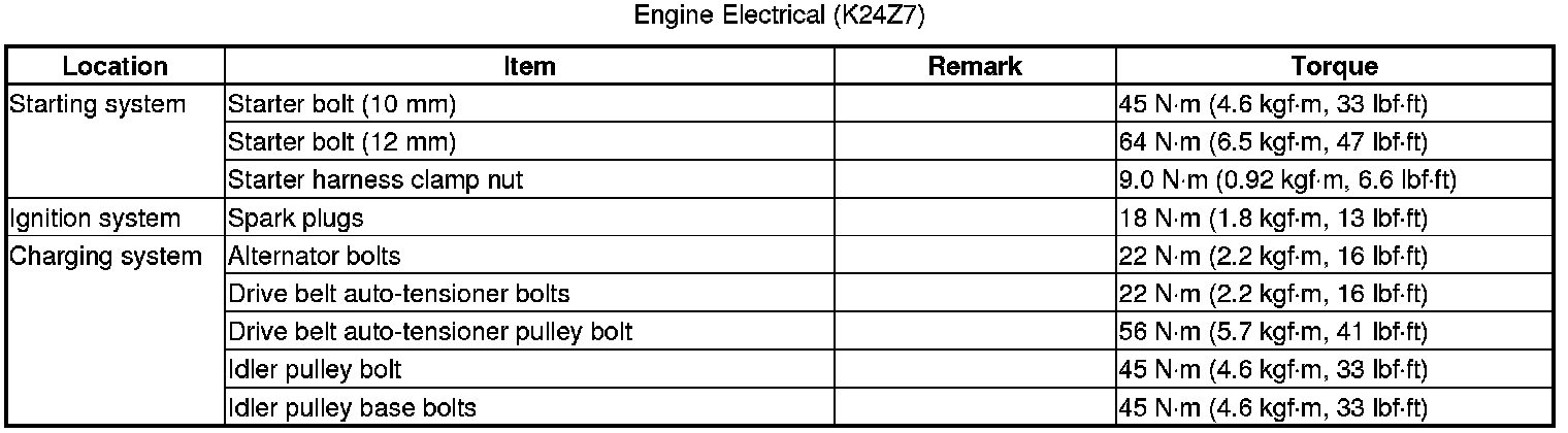 Home >> Honda >> 2012 >> Civic Si L4-2.4L >> Repair and Diagnosis >> Specifications >> Mechanical Specifications >> Powertrain Management >> Ignition System >> System Specifications >> Torque Specifications
